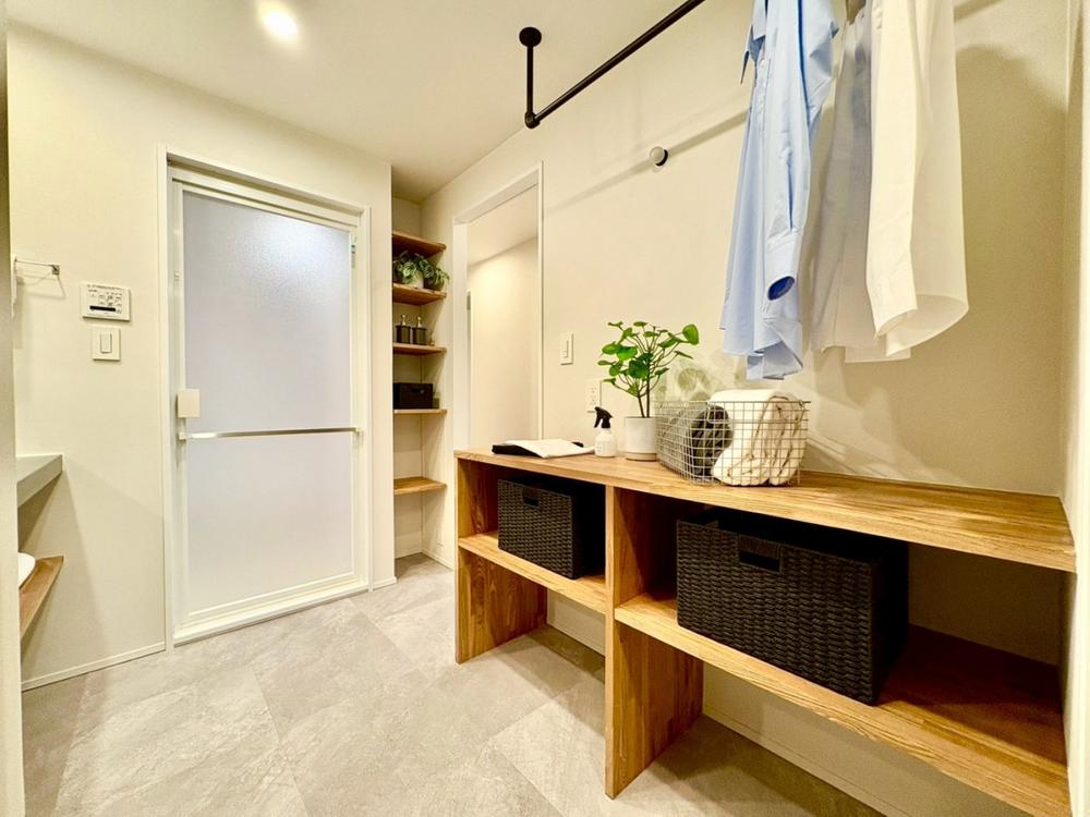 目線に合わせた三面鏡付洗面化粧台を採用しました。三面鏡の裏側には収納棚を確保。スキンケア用品やヘアケア用品などをすっきり整理できます。また収納棚を多く設けており、脱衣スペースを広く確保しております。