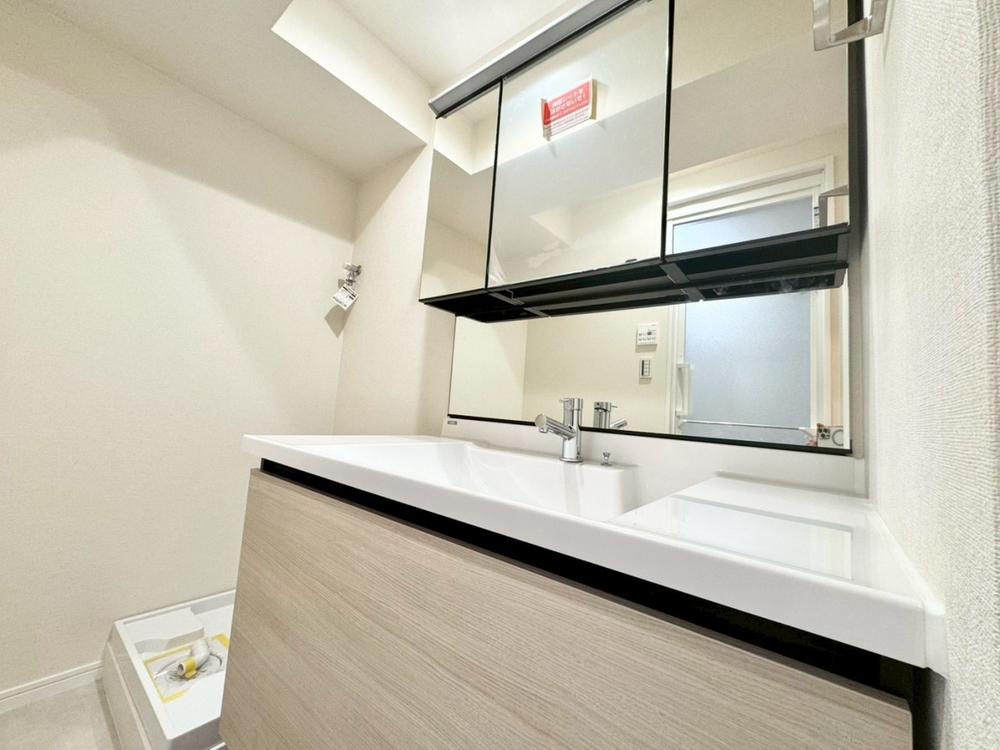 落ち着いた色合いで統一された室内はホテルライクな空間を創造しております。身だしなみのチェックがしやすい大きな鏡、下には収納がたっぷり。可動棚もあるのでスッキリとした空間をお作りいただけます。