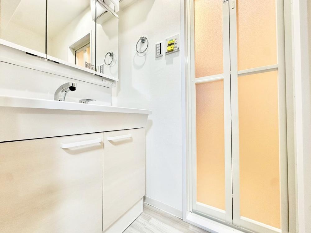 目線に合わせた三面鏡付洗面化粧台を採用しました。三面鏡の裏側には収納棚を確保。スキンケア用品やヘアケア用品などをすっきり整理できます。また収納棚を多く設けており、脱衣スペースを広く確保しております。