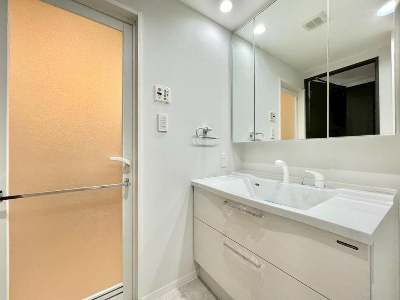 目線に合わせた三面鏡付洗面化粧台を採用しました。三面鏡の裏側には収納棚を確保。スキンケア用品やヘアケア用品などをすっきり整理できます。また収納棚を多く設けており、脱衣スペースを広く確保しております。