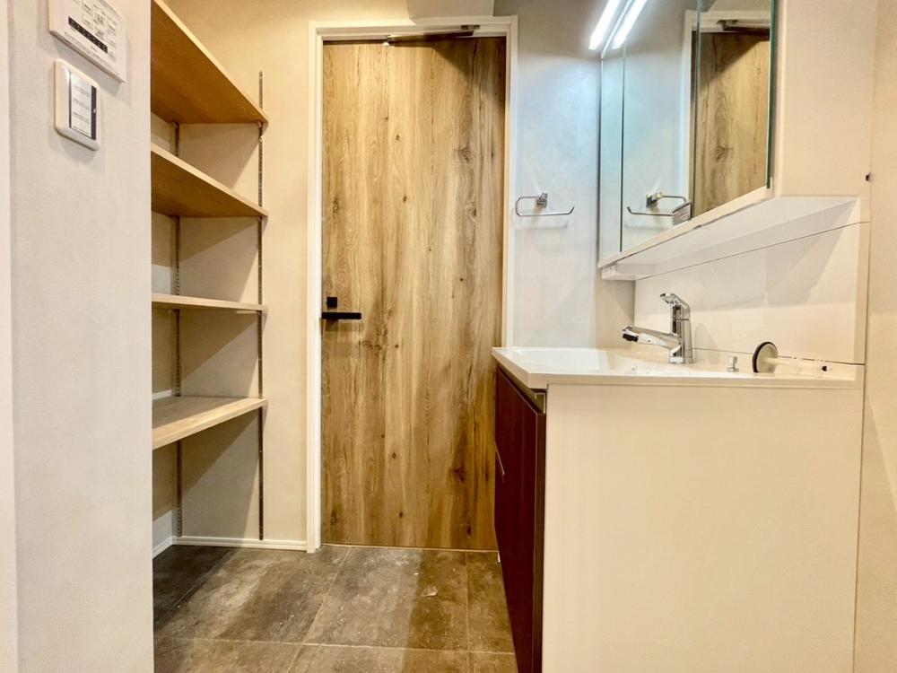 落ち着いた色合いで統一された室内はホテルライクな空間を創造しております。身だしなみのチェックがしやすい大きな鏡、下には収納がたっぷり。可動棚もあるのでスッキリとした空間をお作りいただけます。