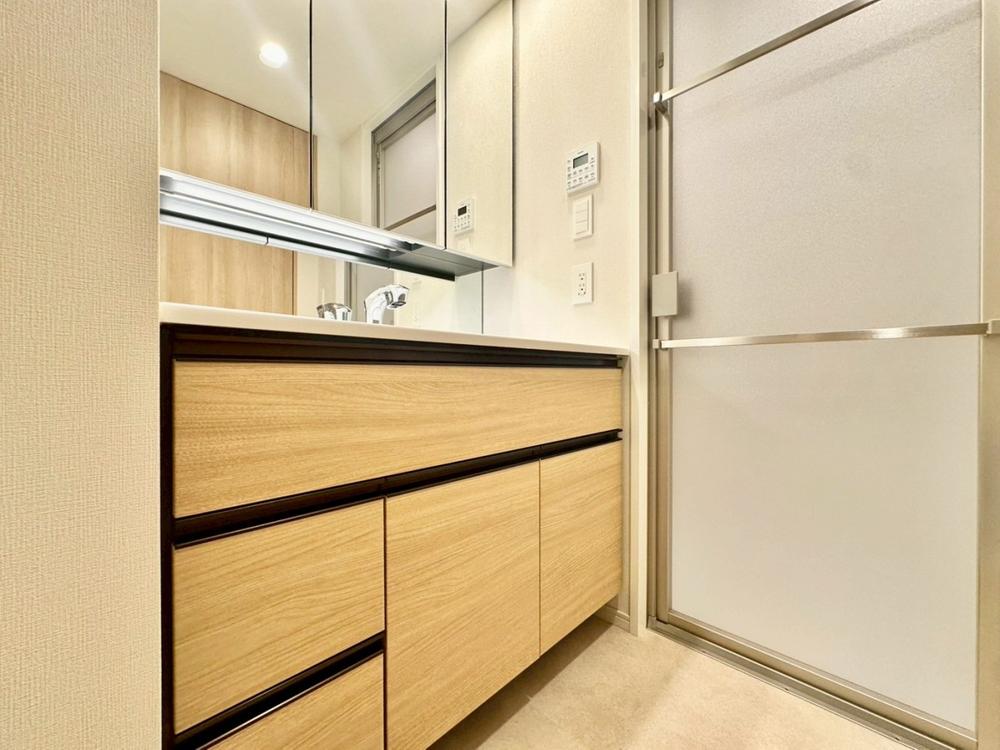 シャワー機能付きの洗面台には使いやすい横長ボウル、スマートに収まる収納と充実しています。あわただしい朝の洗面タイムに心強い設備です。