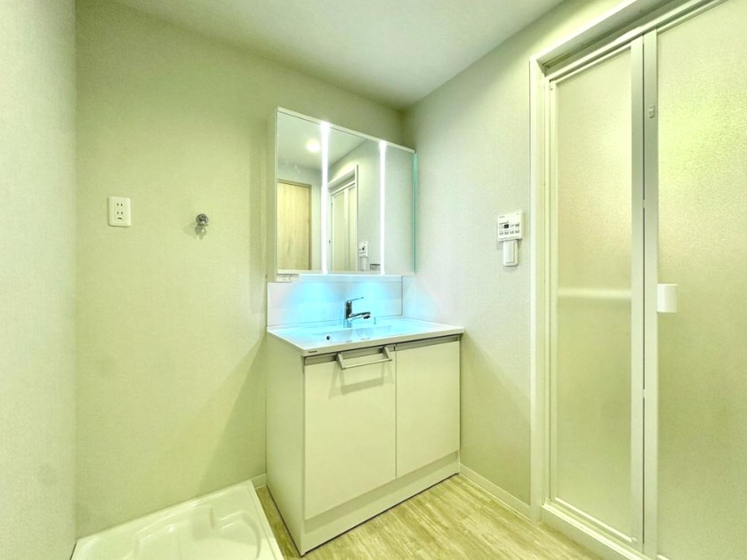 目線に合わせた三面鏡付洗面化粧台を採用しました。三面鏡の裏側には収納棚を確保。スキンケア用品やヘアケア用品などをすっきり整理できます。また収納棚を多く設けており、脱衣スペースを広く確保しております。