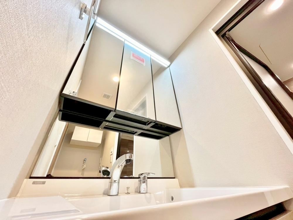シャワー機能付きの洗面台には使いやすい横長ボウル、スマートに収まる収納と充実しています。あわただしい朝の洗面タイムに心強い設備です。