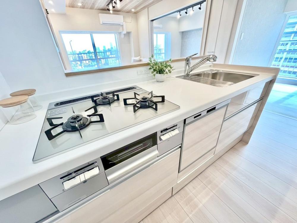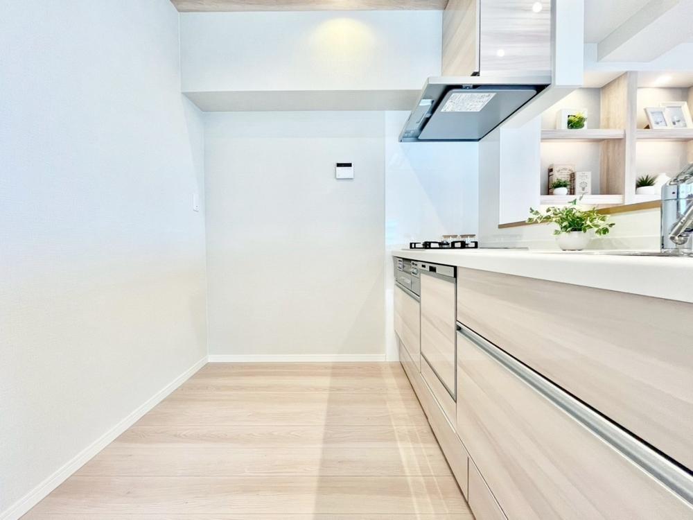 家事の時短に効果的な収納のし易いオールスライド収納、綺麗を保ち易い人造大理石トップ、静音シンクなど、使い勝手の良いキッチンを新規導入致しました。