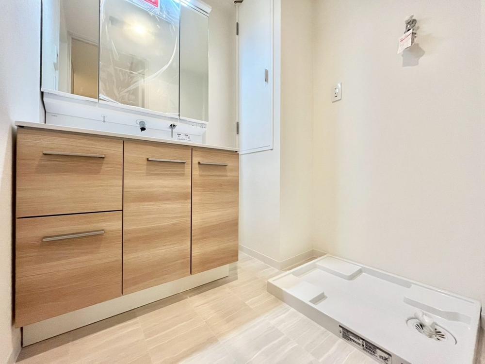 落ち着いた色合いで統一された室内はホテルライクな空間を創造しております。身だしなみのチェックがしやすい大きな鏡、下には収納がたっぷり。可動棚もあるのでスッキリとした空間をお作りいただけます。