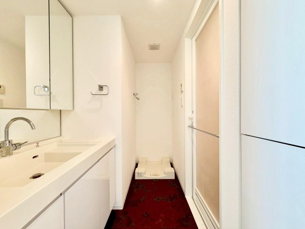 落ち着いた色合いで統一された室内はホテルライクな空間を創造しております。身だしなみのチェックがしやすい大きな鏡、下には収納がたっぷり。可動棚もあるのでスッキリとした空間をお作りいただけます。
