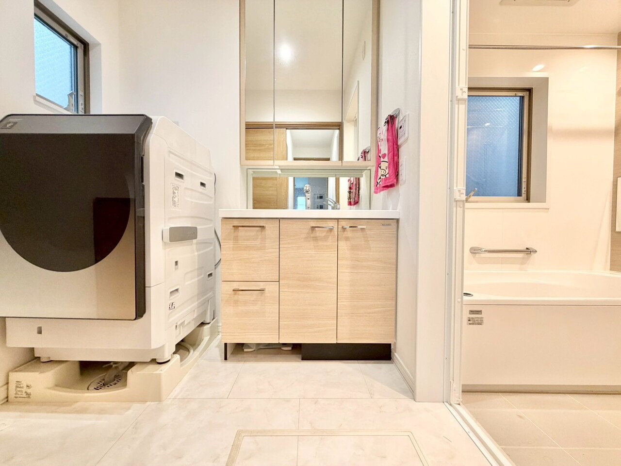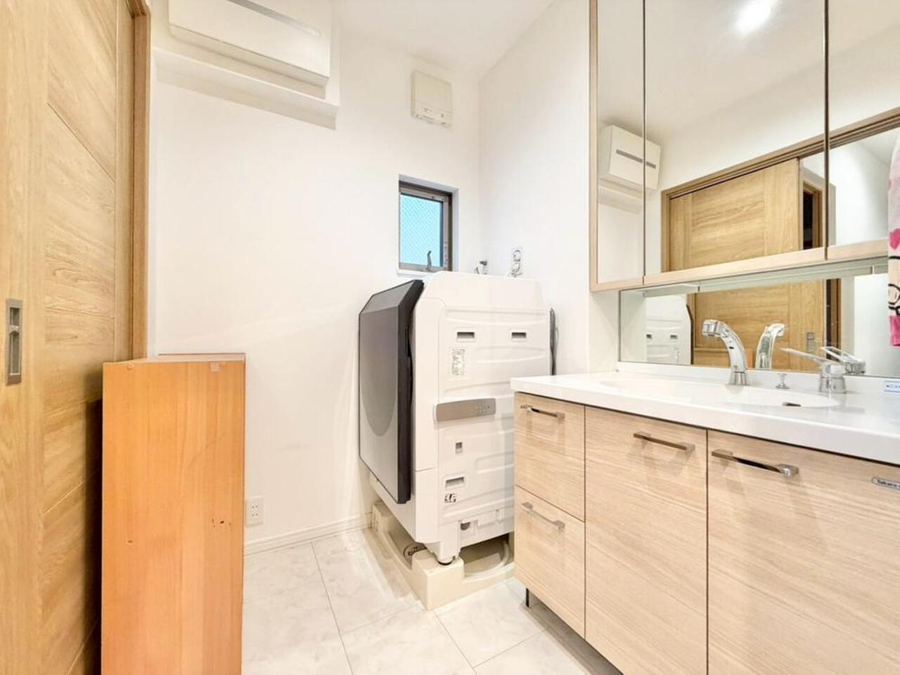 身だしなみのチェックがしやすい大きな鏡、下には収納がたっぷり。スッキリとした空間を演出いたします。