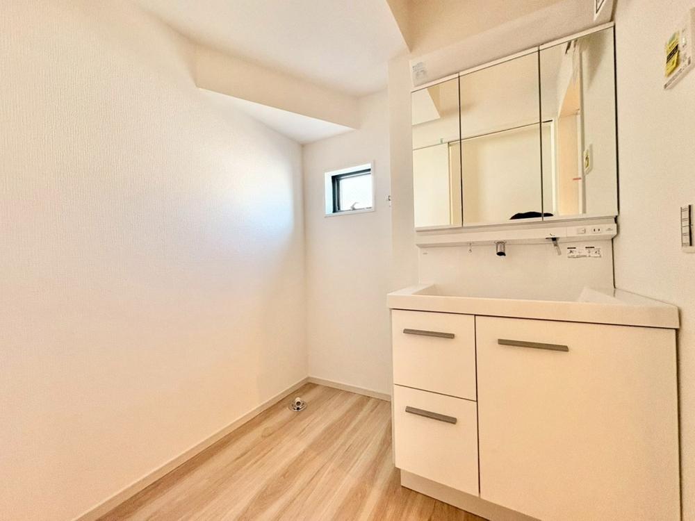 身だしなみのチェックがしやすい大きな鏡、下には収納がたっぷり。スッキリとした空間を演出いたします。