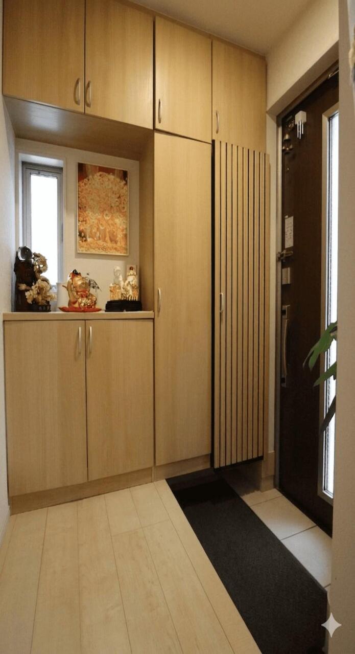 誰が来てもわかる様にモニター付きインターホンを設置。家事導線を考慮した個所に設置し、防犯性と利便性に優れ快適と安らぎを合わせた優しい設計。