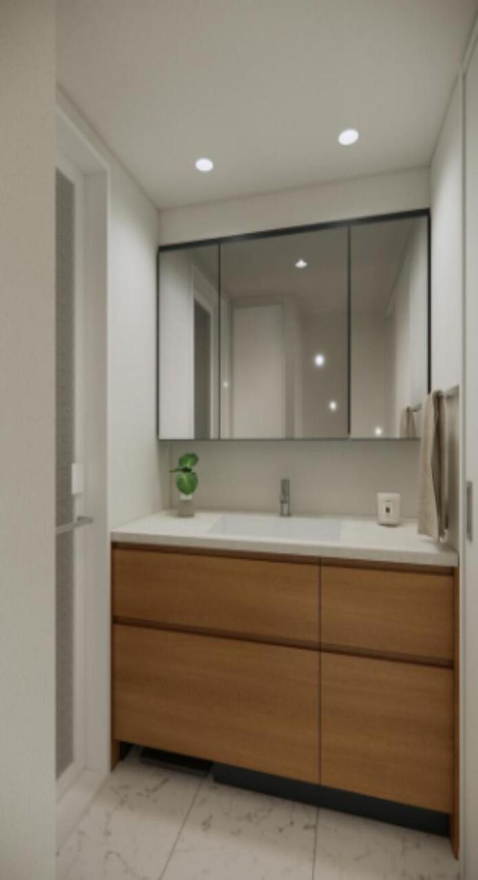 「※完成イメージです。家具・小物は販売価格に含まれません。」十分な大きさの洗面台は収納もさる事ながら、身だしなみチェックや歯磨きなど、朝の慌ただしい時間でもホテルライクなスペースで余裕とゆとりを感じて