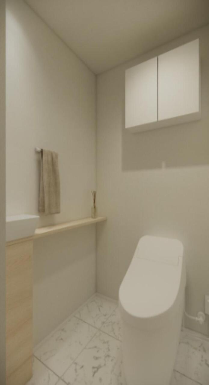 「※完成イメージです。家具・小物は販売価格に含まれません。」十分な広さと清潔感のあるカラーで纏まったおトイレ。
