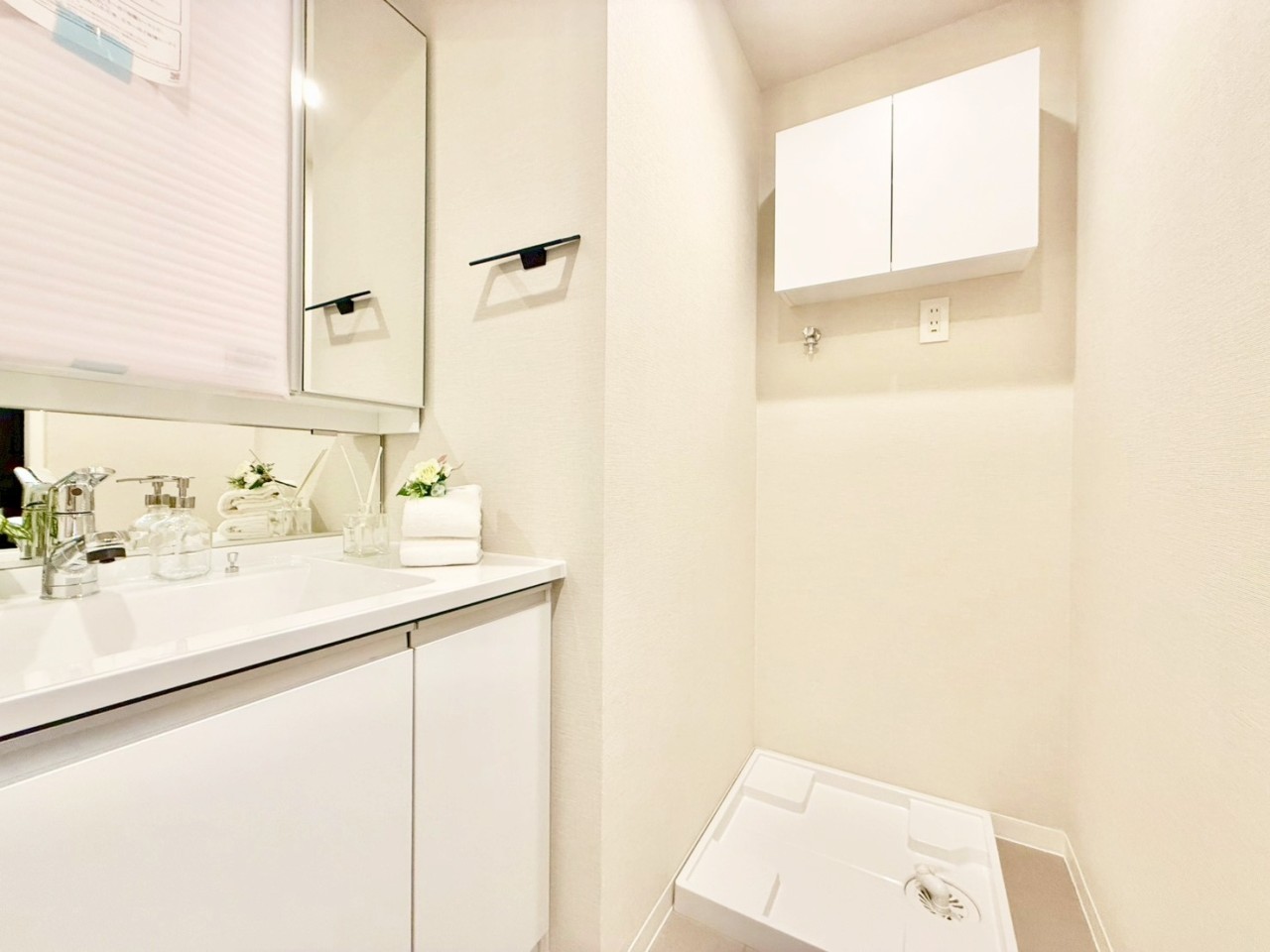 身だしなみのチェックがしやすい大きな鏡、下には収納がたっぷり。スッキリとした空間を演出いたします。