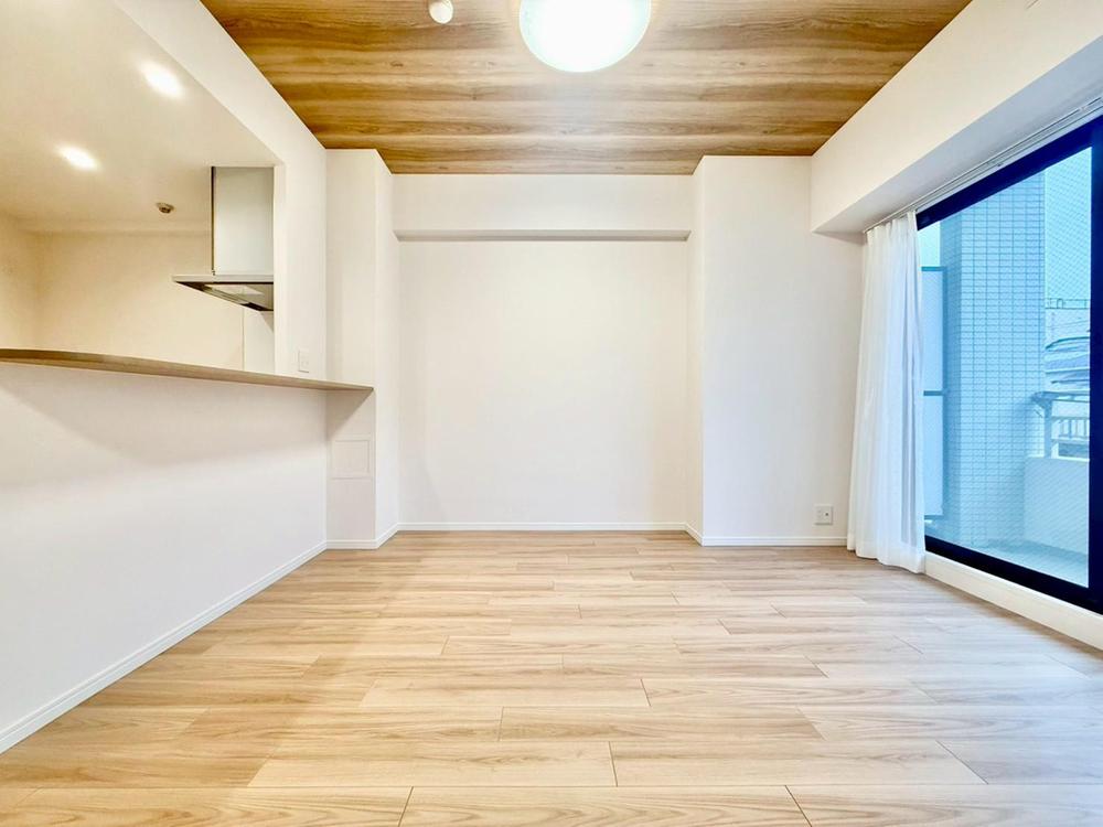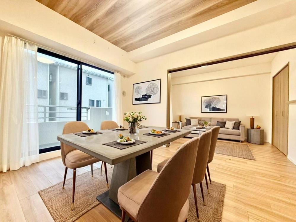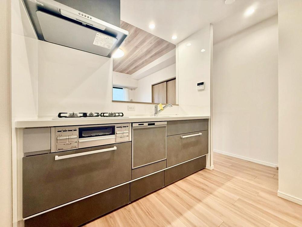 食洗機付きの広々としたシステムキッチンで、毎日の家事もスムーズに。鏡に映る木目調の天井が空間に温かみを添え、家族の笑顔が溢れる食卓を演出します。