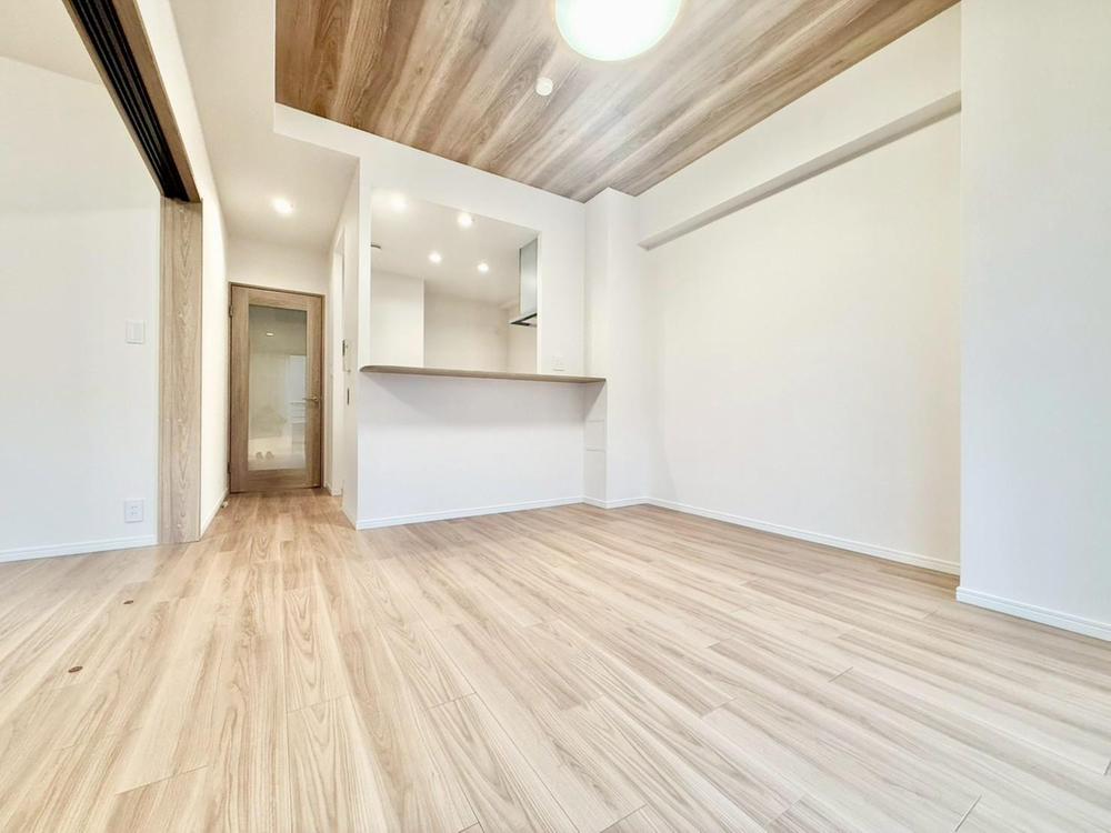 木のぬくもりを感じる木目調の天井とフローリングが、家族の団らんを優しく包むリビングです。対面キッチンで会話も弾み、明るい空間で毎日を豊かに過ごせます。