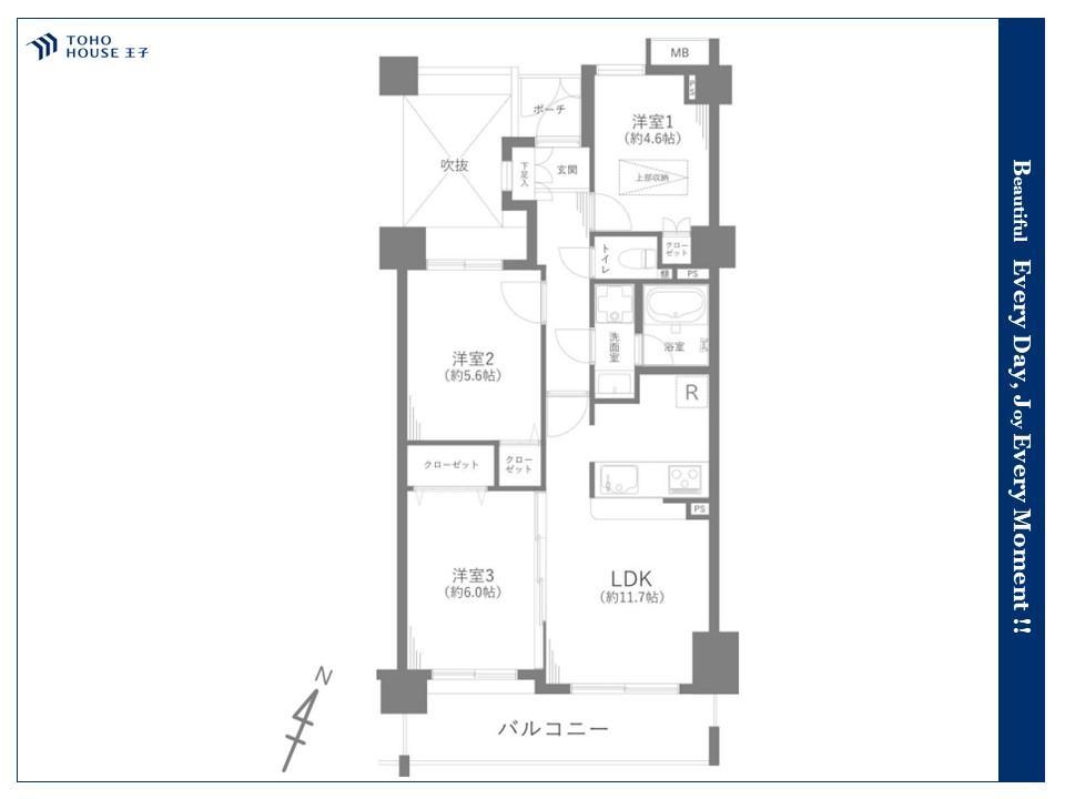 お子様の成長に合わせた部屋割りも可能な3LDK。約11.7帖のLDKは家族の会話が弾む中心となり、充実した収納で家事効率もアップします。