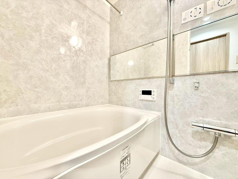 明るい大理石調の壁が清潔感を演出する浴室。ゆったり浴槽で、お子様との楽しいバスタイムや一日の疲れを癒すくつろぎの時間をお過ごしください。