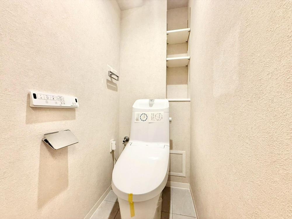 毎日使う場所だからこそ、清潔感と機能性を重視しました。便利なリモコンと収納棚で、家族みんなが快適に過ごせる、明るいトイレ空間です。