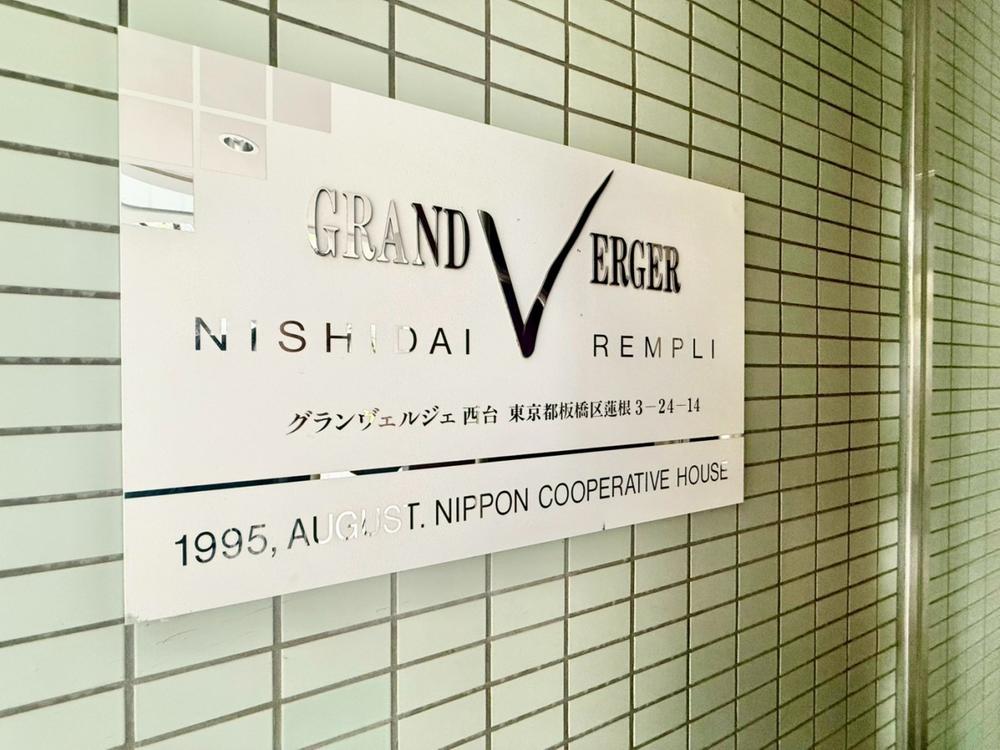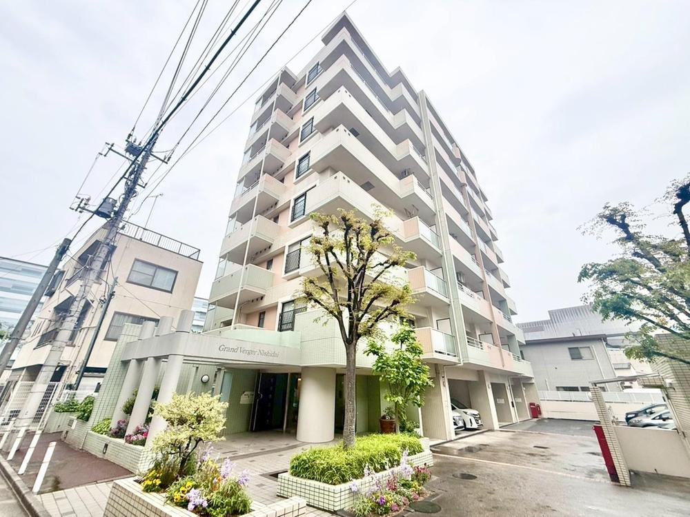 「Grand Verger Nishidai」の美しい外観。緑豊かなエントランスが、家族の帰りを温かく迎えます。洗練されたデザインは、子育て世代の毎日を豊かに彩るでしょう。