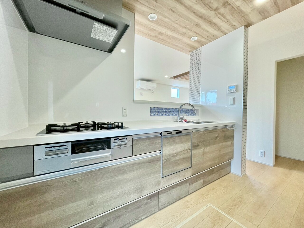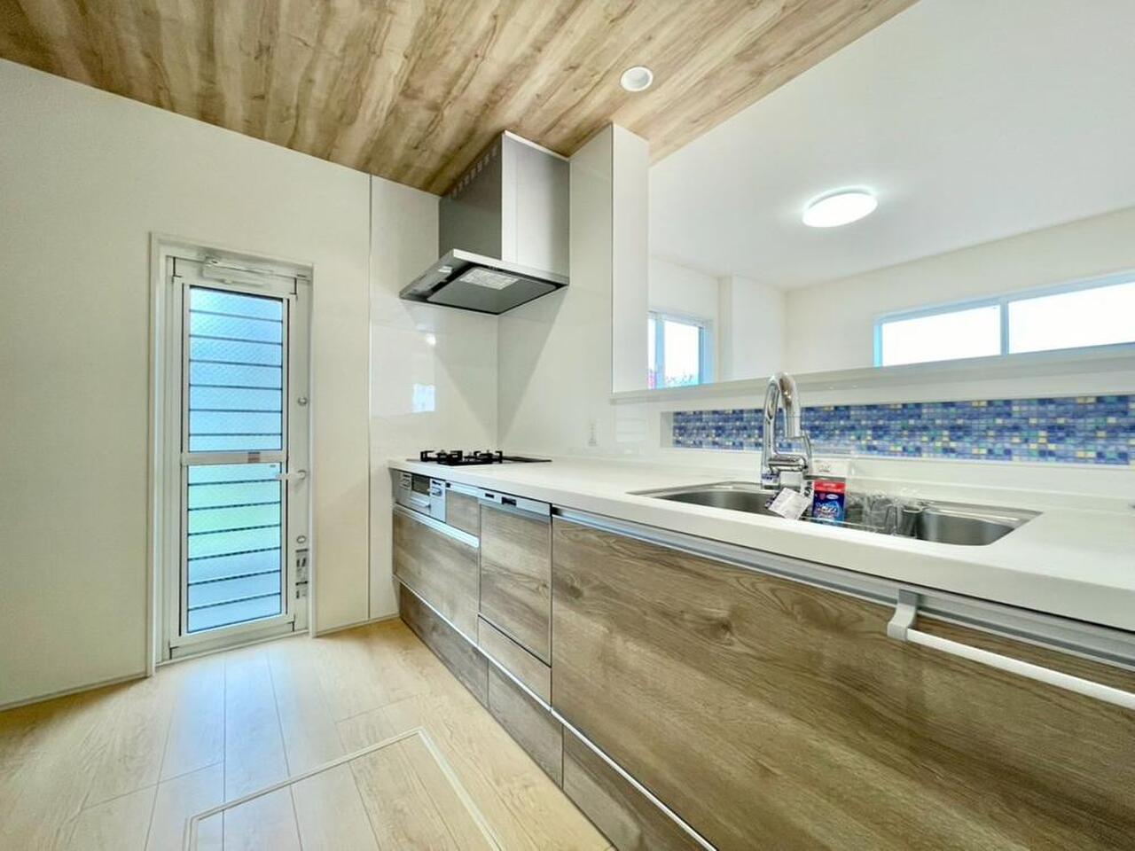 作業スペースを多くとったキッチン。夫婦そろってキッチンに立っても調理がしやすくゆとりある広さ。食器類もすっきりと片付く収納力が期待できます。家事をしながら会話も弾みます。