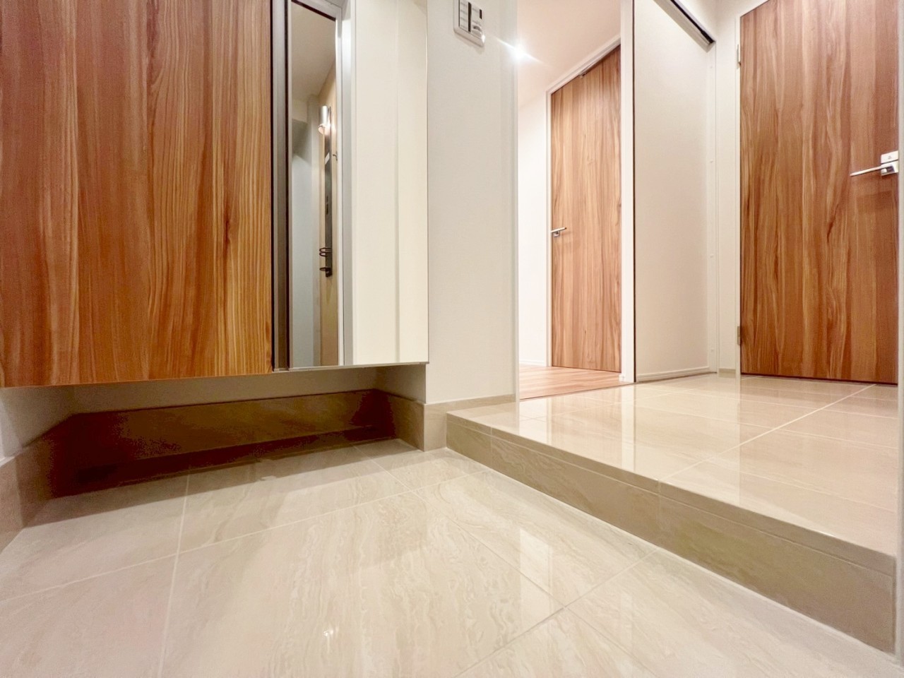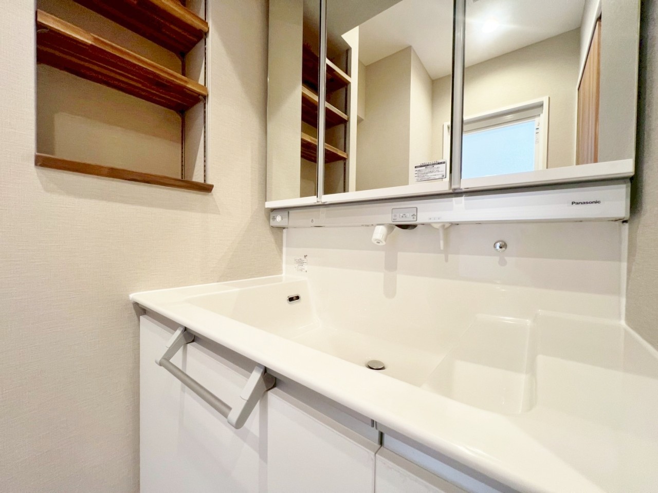 身だしなみのチェックがしやすい大きな鏡、下には収納がたっぷり。スッキリとした空間を演出いたします。