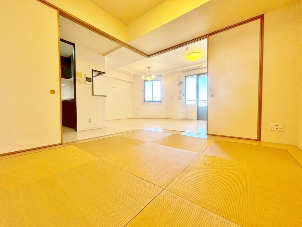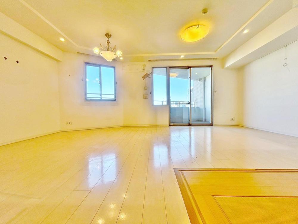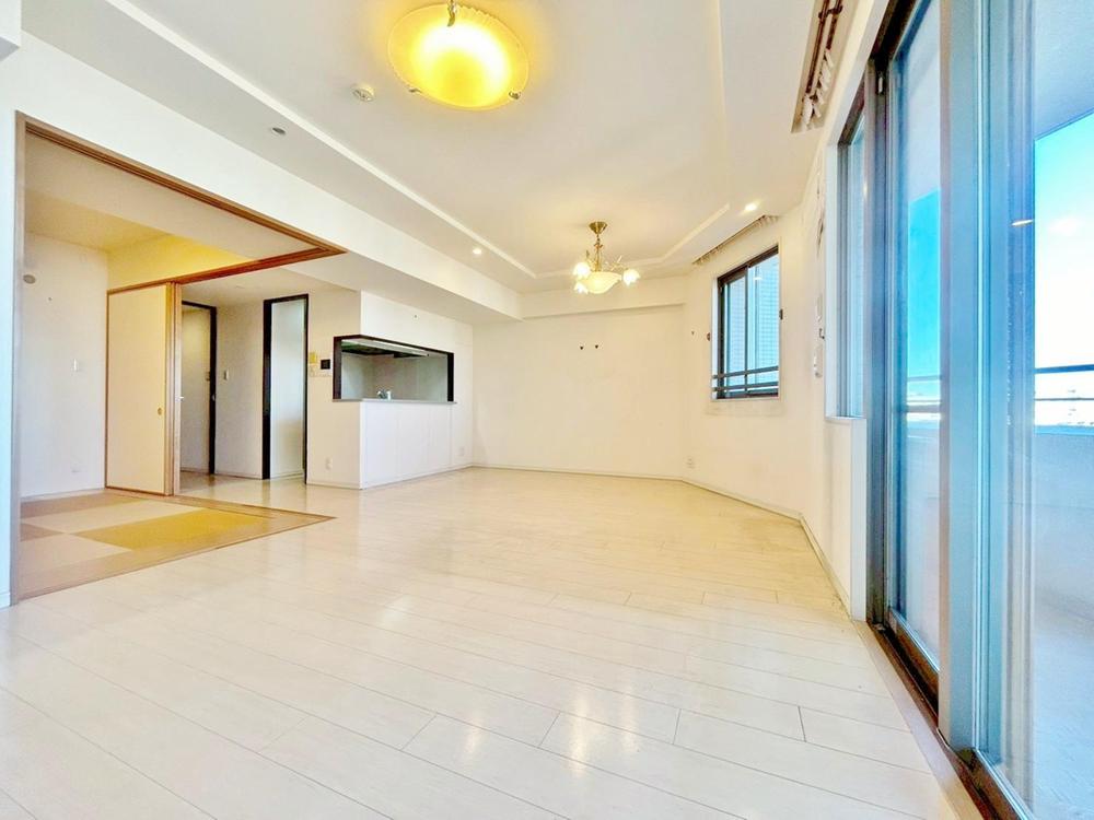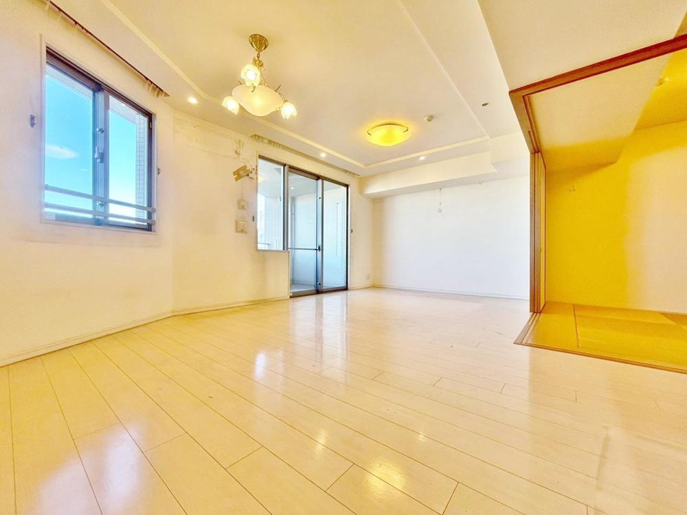 陽光が降り注ぐ明るいリビングと、隣接する和室。お子様の遊び場や家族団らんの場として、多様な使い方が可能です。
