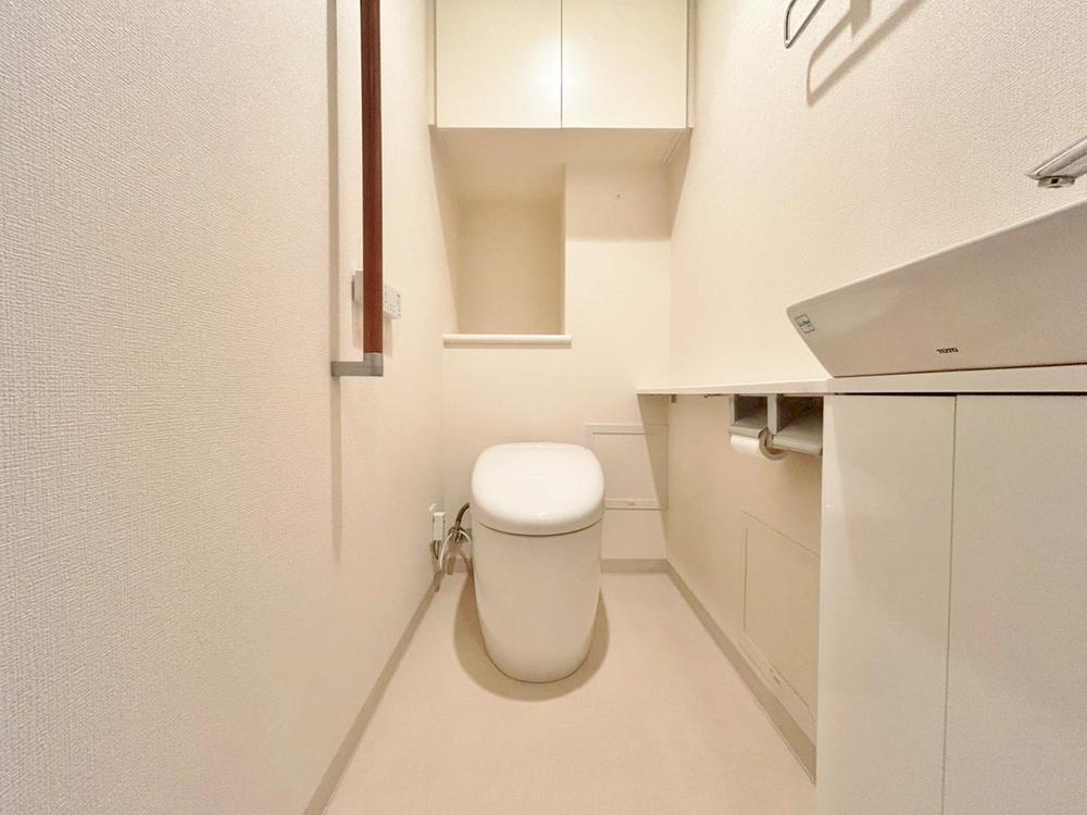 清潔感あふれるモダンなトイレは、上部収納と手洗い器付きで機能的。家族みんなが快適に使える空間です。
