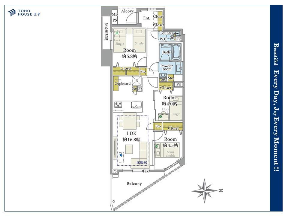 床暖房付き16.8帖LDKは家族団らんの中心。各居室に収納があり、お子様の成長と共に変化するライフスタイルに対応できる間取りです。