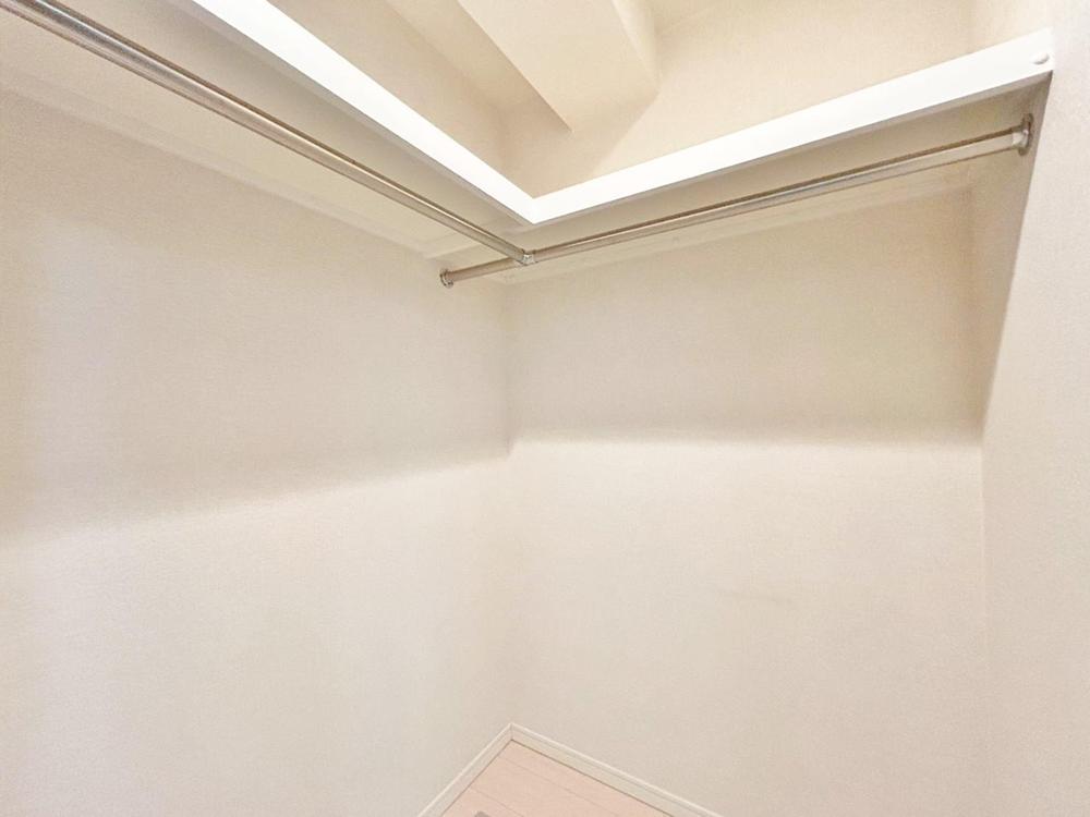 家族の衣類をまとめて収納できる、広々としたウォークインクローゼット。L字型のハンガーパイプで整理整頓もスムーズ。明るい空間で、毎日のお出かけ準備も快適です。