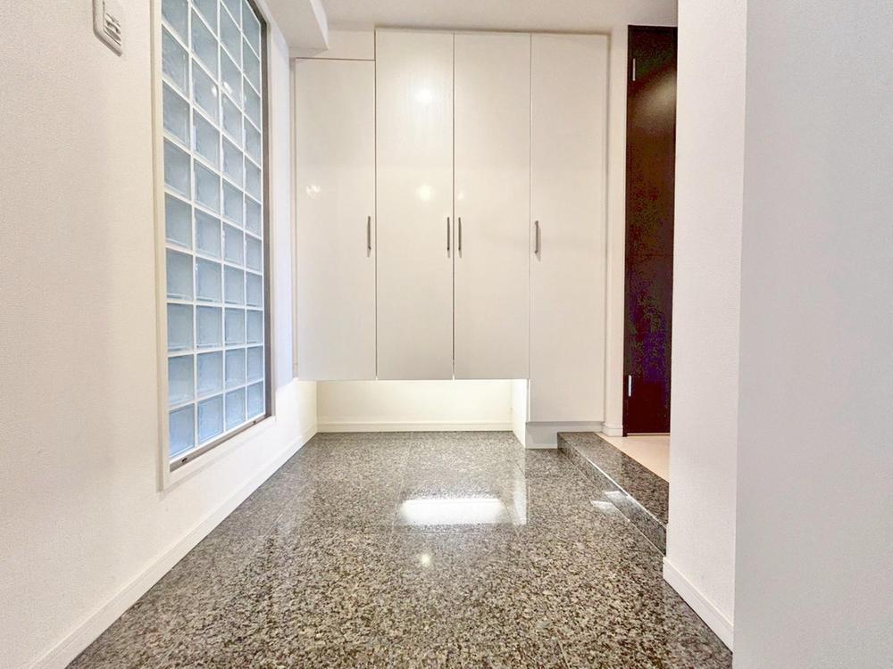 光を採り込むガラスブロックが印象的な玄関。大容量のシューズクロークで家族の靴もすっきり片付き、いつも気持ちの良い空間を保てます。