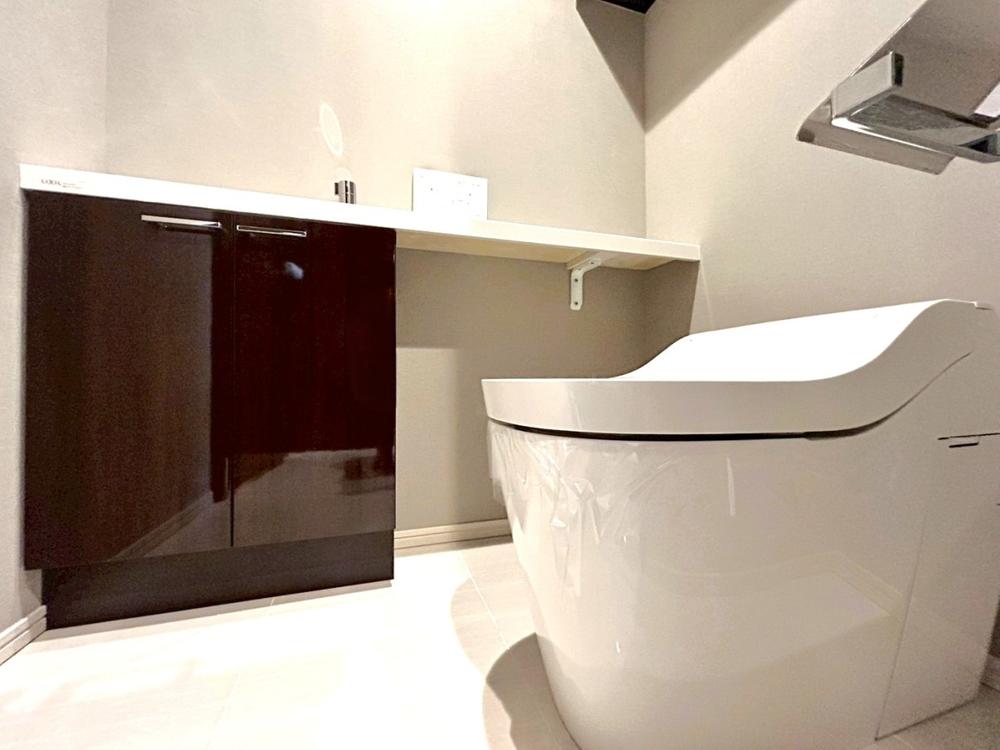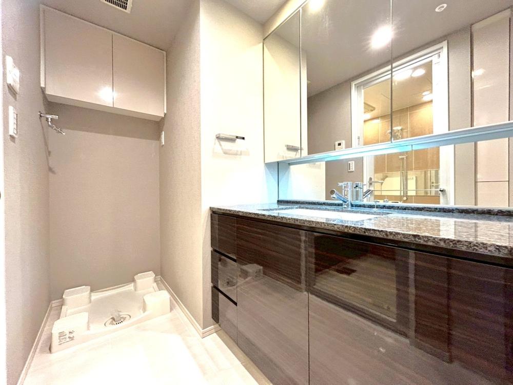 落ち着いた色合いで統一された室内はホテルライクな空間を創造しております。身だしなみのチェックがしやすい大きな鏡、下には収納がたっぷり。可動棚もあるのでスッキリとした空間をお作りいただけます。
