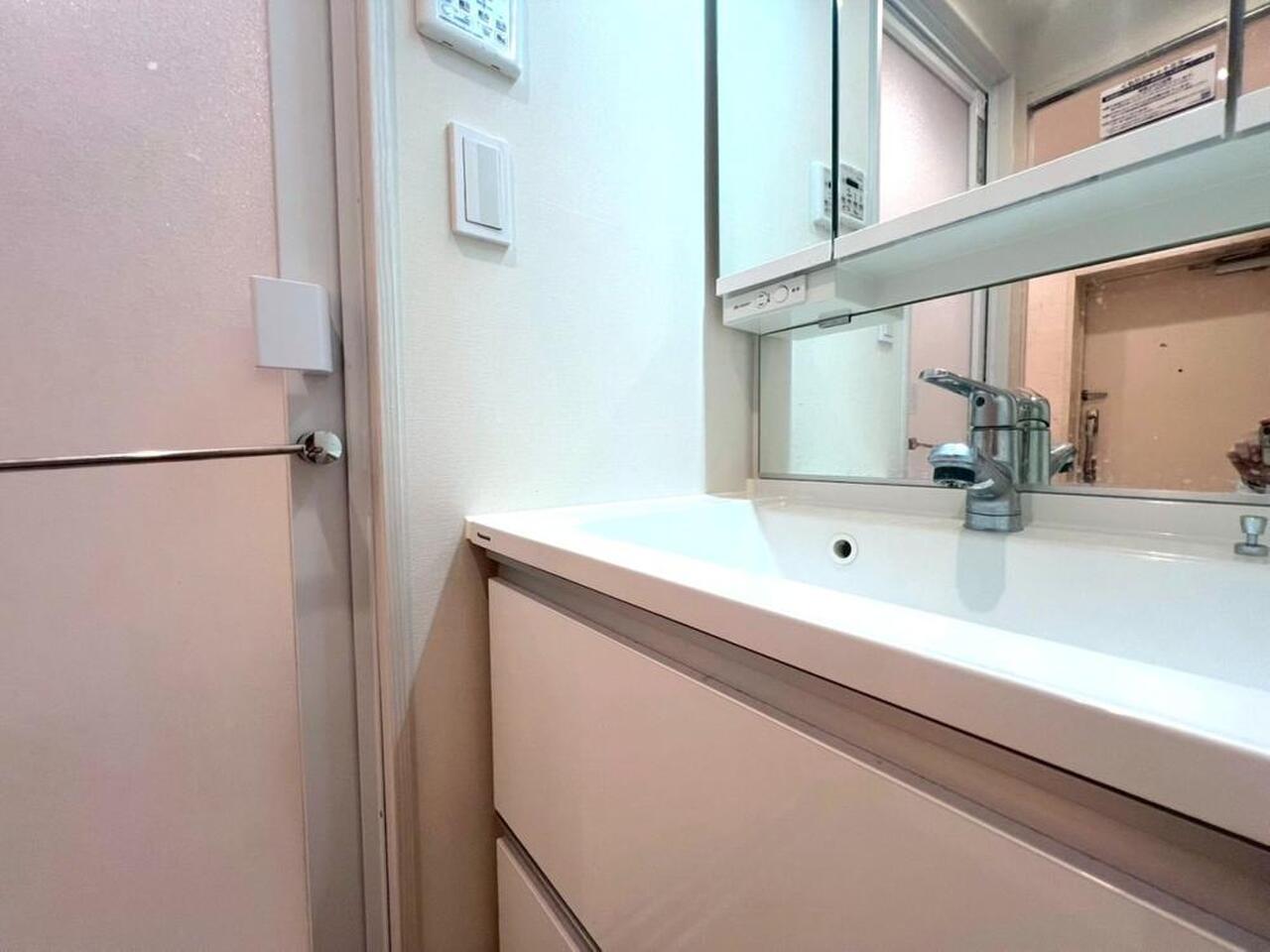大きく見やすい三面鏡で清潔感ある洗面台。収納も多く、コスメ等もスッキリと仕舞えます。キッチンに隣接した位置関係ですので、家事動線もよく、ご家族のコミュニケーションが生まれ易い配置となっています。