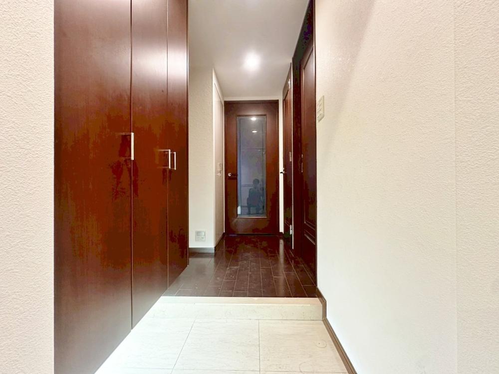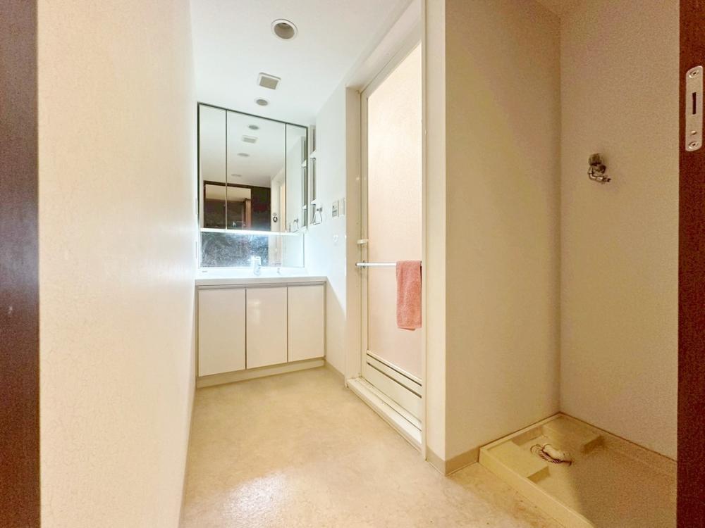 落ち着いた色合いで統一された室内はホテルライクな空間を創造しております。身だしなみのチェックがしやすい大きな鏡、下には収納がたっぷり。可動棚もあるのでスッキリとした空間をお作りいただけます。