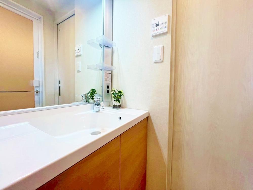 大きく見やすい三面鏡で清潔感ある洗面台。収納も多く、コスメ等もスッキリと仕舞えます。キッチンに隣接した位置関係ですので、家事動線もよく、ご家族のコミュニケーションが生まれ易い配置となっています。