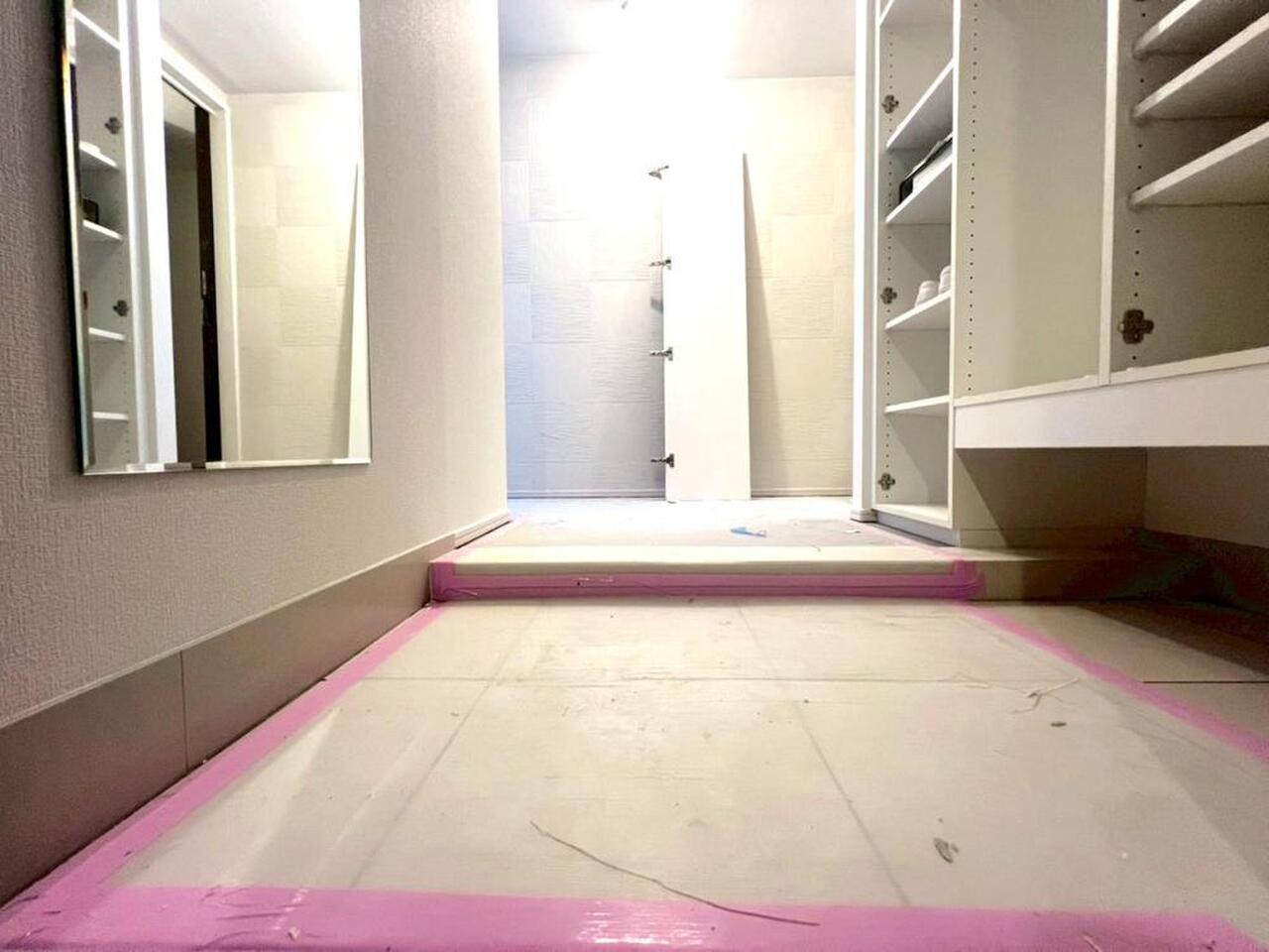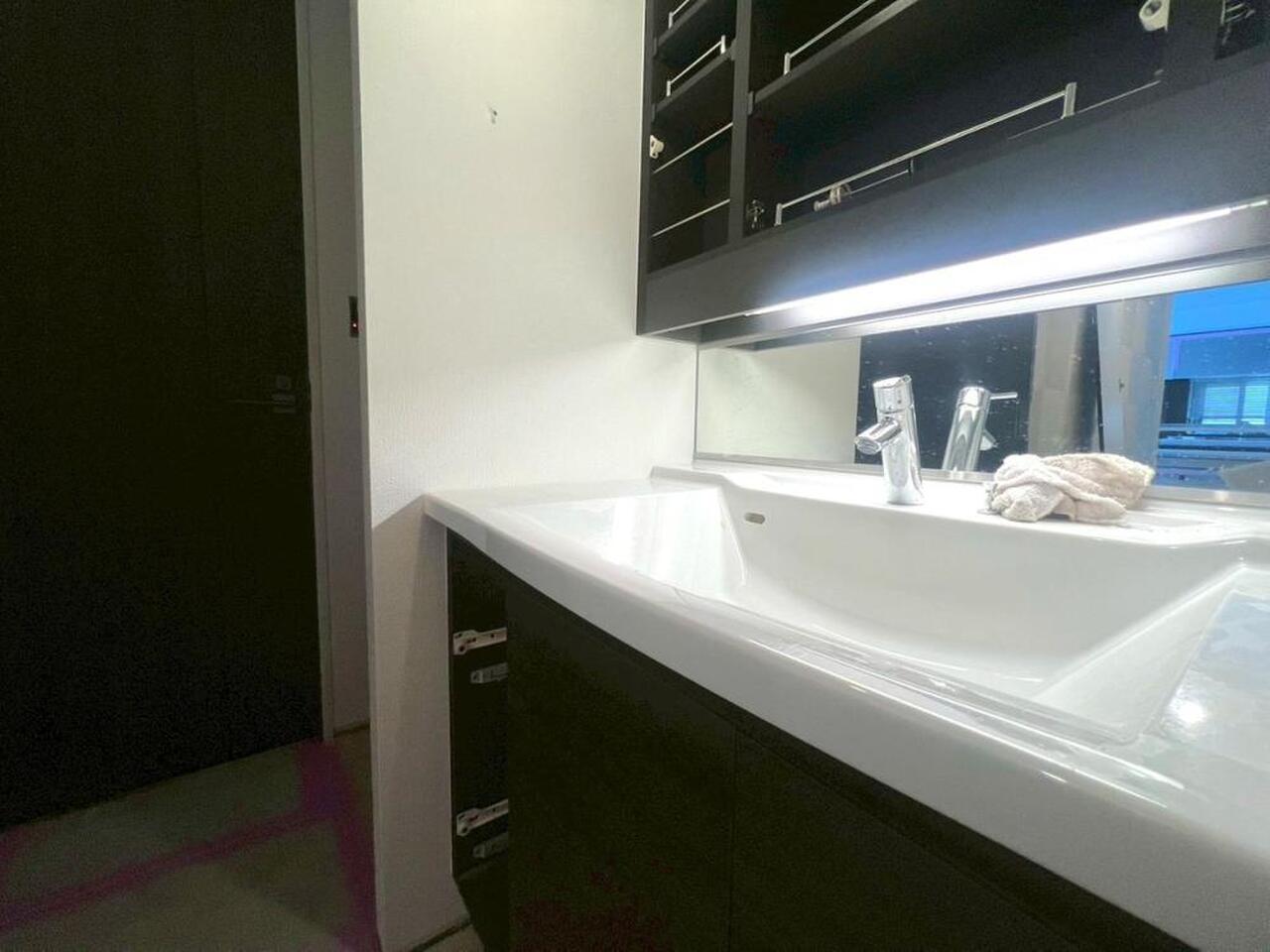 大きく見やすい三面鏡で清潔感ある洗面台。収納も多く、コスメ等もスッキリと仕舞えます。キッチンに隣接した位置関係ですので、家事動線もよく、ご家族のコミュニケーションが生まれ易い配置となっています。