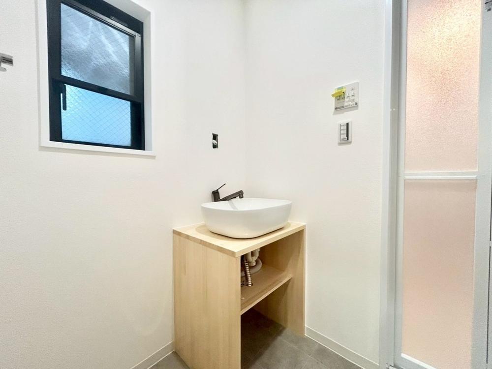 シャワー機能付きの洗面台には使いやすい横長ボウル、スマートに収まる収納と充実しています。あわただしい朝の洗面タイムに心強い設備です。