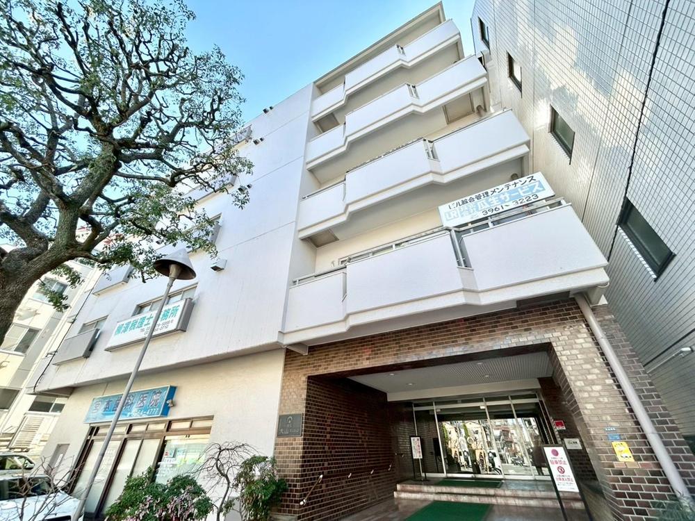 青空に映える清潔感のある白い外観が魅力です。クリニックや事務所も入居しており、家族の暮らしをサポートする施設が身近に揃っています。
