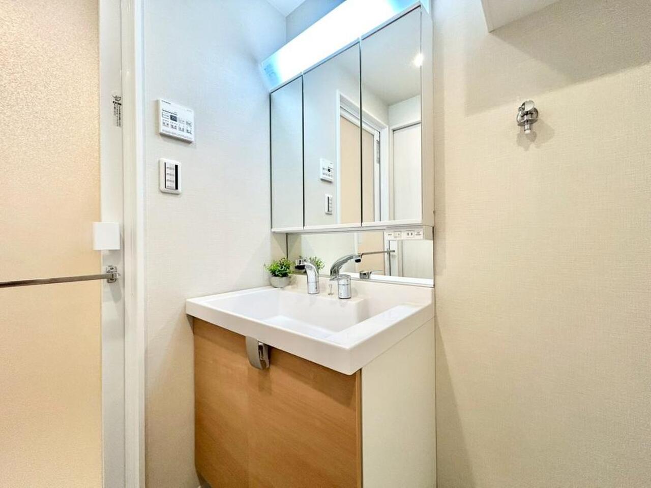 シャワー機能付きの洗面台には使いやすい横長ボウル、スマートに収まる収納と充実しています。あわただしい朝の洗面タイムに心強い設備です。