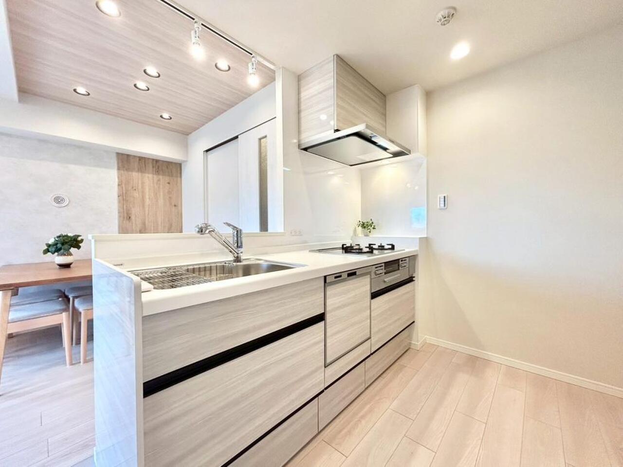 作業スペースを多くとったキッチン。夫婦そろってキッチンに立っても調理がしやすくゆとりある広さ。食器類もすっきりと片付く収納力が期待できます。家事をしながら会話も弾みます。