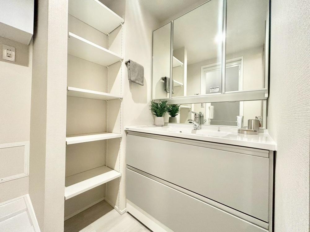 シャワー機能付きの洗面台には使いやすい横長ボウル、スマートに収まる収納と充実しています。あわただしい朝の洗面タイムに心強い設備です。