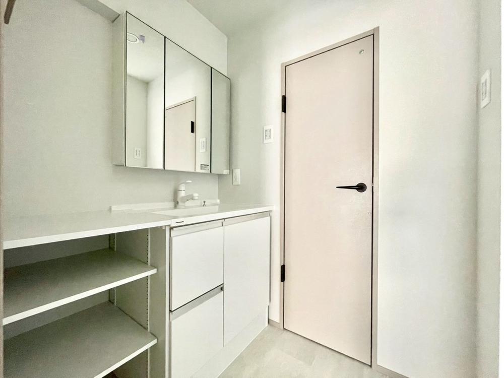 落ち着いた色合いで統一された室内はホテルライクな空間を創造しております。身だしなみのチェックがしやすい大きな鏡、下には収納がたっぷり。可動棚もあるのでスッキリとした空間をお作りいただけます。