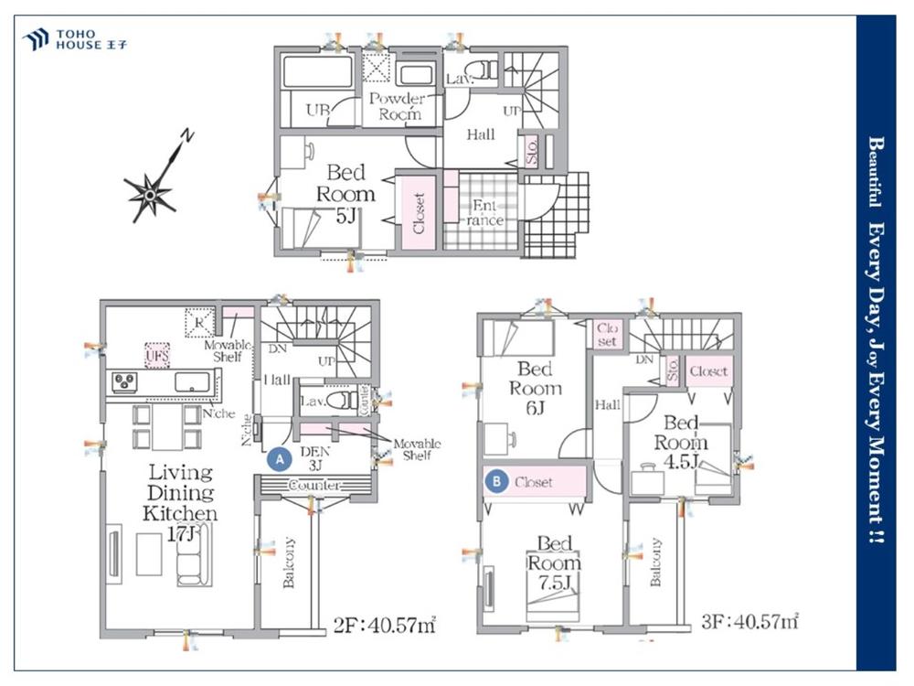 「一号棟」会話が弾むリビング、料理が愉しくなるキッチン、明日への活力を養うベッドルーム。家は、ただ生活する場ではなく、暮らしを愉しく、快適にする場所。笑顔の毎日、安らぎの日々のために、最新の設備・仕様