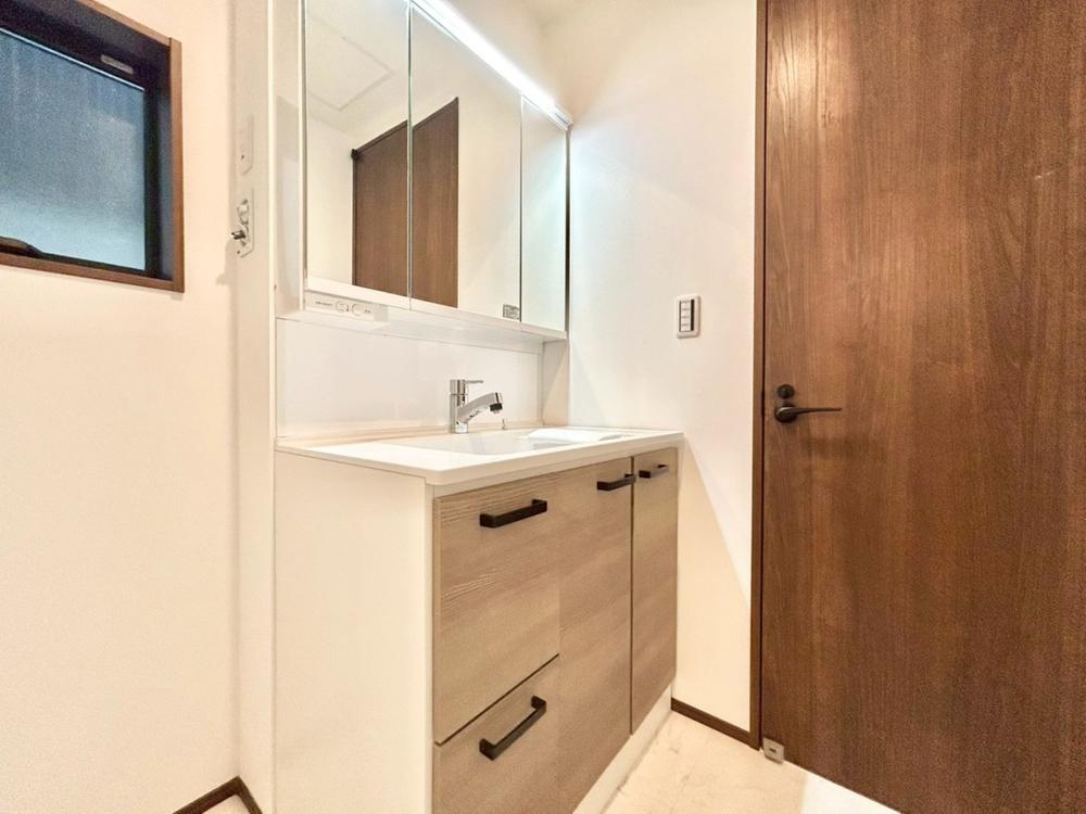 「一号棟」十分な大きさの洗面台は収納もさる事ながら、身だしなみチェックや歯磨きなど、朝の慌ただしい時間でもホテルライクなスペースで余裕とゆとりを感じて頂けます。