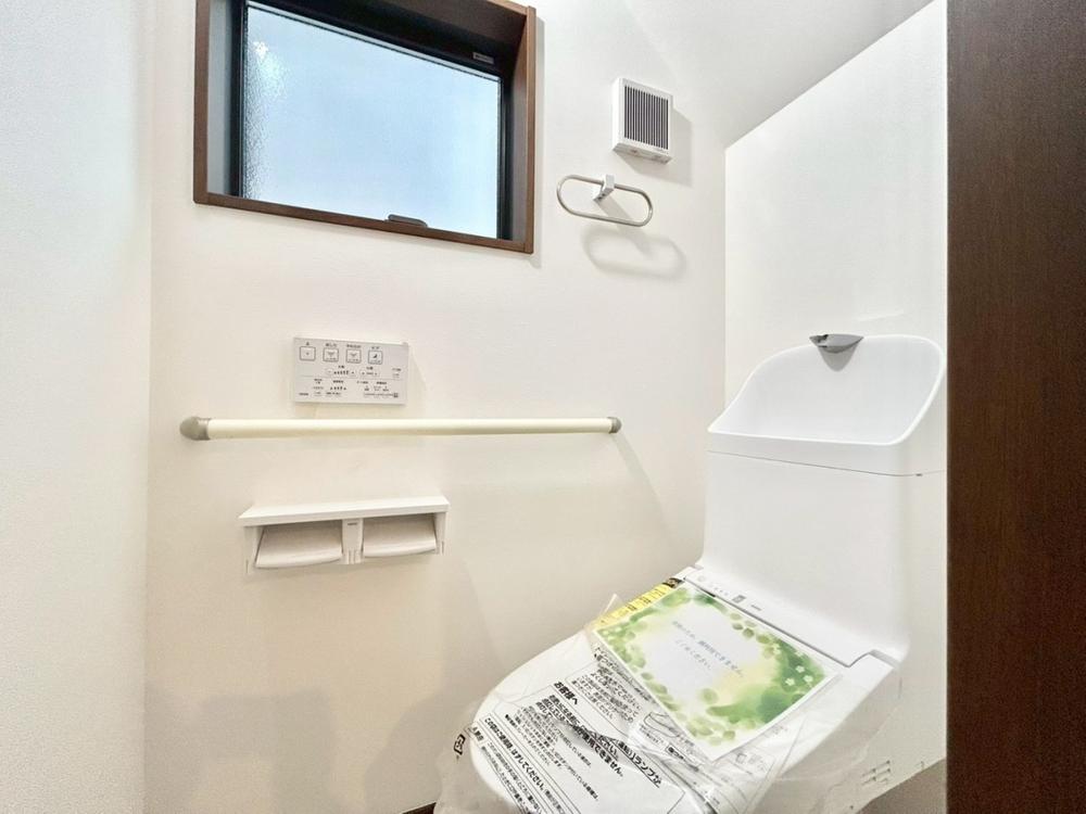 「一号棟」いつまでも清潔な空間であって頂けますように、目に留まるだけではなく、汚れをふき取り易いフロアと壁紙をチョイス致しました。洗浄便座になっておりますので、とても清潔にご使用いただけます。