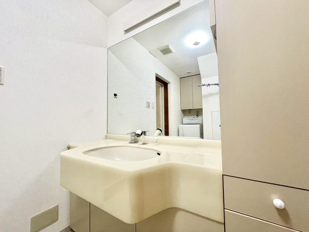 目線に合わせた三面鏡付洗面化粧台を採用しました。三面鏡の裏側には収納棚を確保。スキンケア用品やヘアケア用品などをすっきり整理できます。また収納棚を多く設けており、脱衣スペースを広く確保しております。