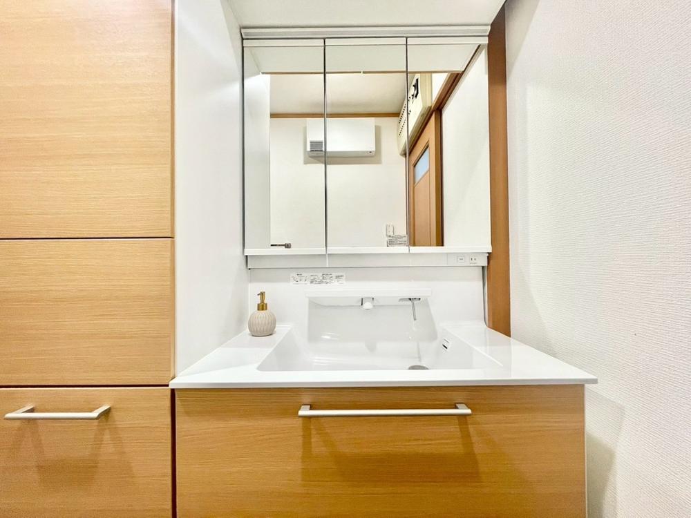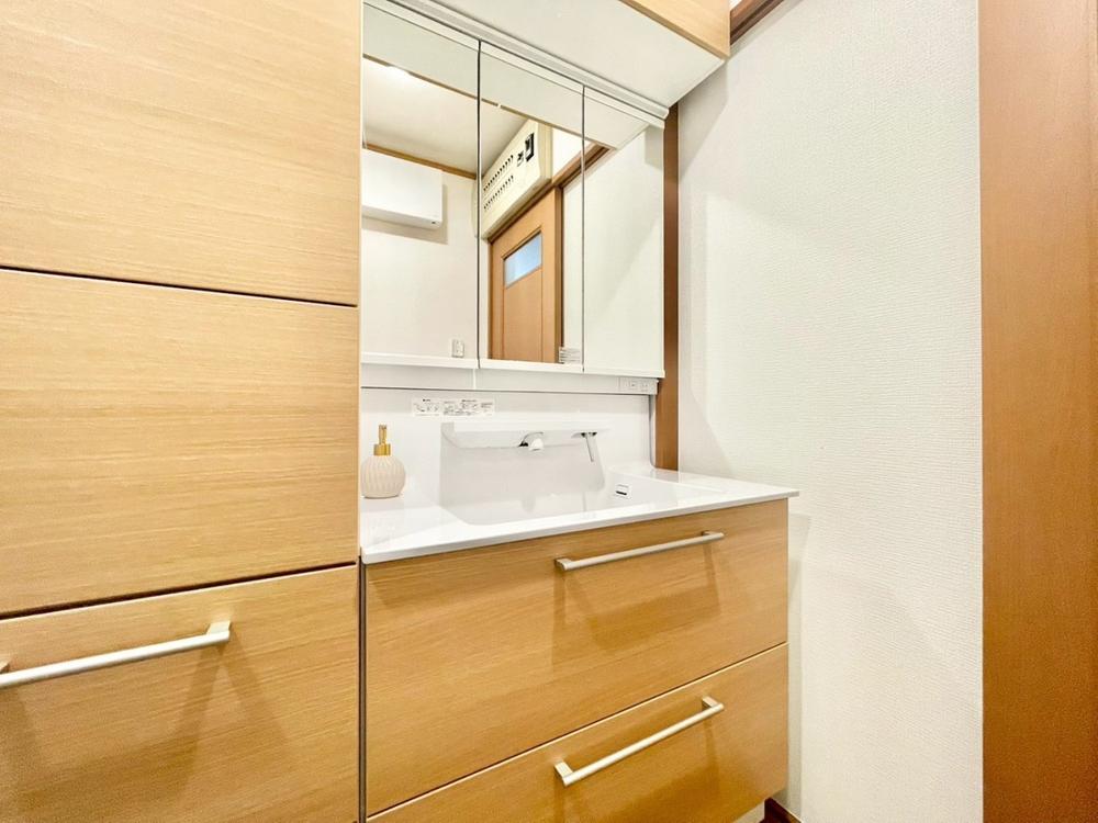 シャワー機能付きの洗面台には使いやすい横長ボウル、スマートに収まる収納と充実しています。あわただしい朝の洗面タイムに心強い設備です。