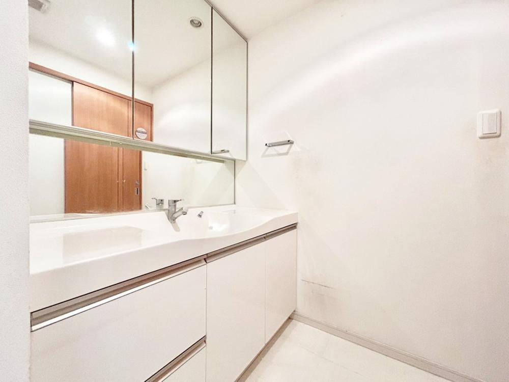目線に合わせた三面鏡付洗面化粧台を採用しました。三面鏡の裏側には収納棚を確保。スキンケア用品やヘアケア用品などをすっきり整理できます。また収納棚を多く設けており、脱衣スペースを広く確保しております。